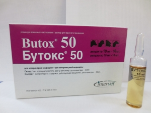 Бутокс® 50 Профілактика і лікування захворювань великої рогатої худоби і овець, спричинюваних ектопаразитами Опис Прозора масляниста рідина світло-жовтого кольору з різким запахом. При змішуванні з водою утворює емульсію білого кольору. Склад 100 мл препарату містять діючу речовину: дельтаметрин – 5 г. Допоміжні речовини: лимонна кислота, кальцію додецилфеніл сульфонат, метоксипропанол ацетат, поліетоксилат три-тер-бутилфенол, ароматичний розчинник. Фармакологічні властивості АТС vet QP53F, інсектициди (QP53 FАОЗ, дельтшиетрин) Діюча речовина препарату – дельтаметрин (група піретроїдів) ефективно діє при безпосередньому контакті на кліщів, вошей та мух, які паразитують на шкірі тварин. Механізм дії дельтаметрину полягає в активації натрієвих каналів мембран нервових клітин, незворотній деполяризації клітинних мембран і блокаді нервової провідності, що призводить до порушення рухових рефлексів, і в результаті чого настає повний параліч і загибель паразитів. Застосування Профілактика і лікування великої рогатої худоби і овець при ураженні ектопаразитами (кліщі, воші, волосоїди, мухи, ґедзі, клопи, мошки): велика рогата худоба: кліщі – Psoroptes bovis, Sшcoptes bovis; воші – Linognathиs vitиli (у телят); вівці: кліщі – Psoroptes ovis, Saгcoptes ovis, воші – Linognathиs ovillиs і L. pedalis; рунець овечий – Melophagus ovinиs. Дозування Застосовується лише зовнішньо. Захворювання Обприскування, кількість Бутокса® 50 мл/ 100 л води Купання, кількість Бутокса® 50,1л/100 л води Кратність обробки псороптоз, саркоптоз 100 100-150 З лікувальною метою – дворазово з інтервалом у 10 діб;з профілактичною метою – одноразово кожні 6 місяців сифункулятоз,мелофаrоз 25 25-37,5 Одноразово, повторна обробка залежить від рівня ураження паразитами арахноентомози 50 50-75 Одноразова обробка захищає тварин впродовж 6 – 8 тижнів Обробку тварин проводять у суху погоду за температури не нижче 12 °С. Купання тварин Після очищення ванни для купання, попередньо готують необхідну кількість суміші Бутокса® 50 (у відповідності з дозуванням для купання). Розподіляють розчин по всьому об’єму ємності, потім перемішують протягом 10 хвилин. Щоб отримати готову емульсію, спочатку необхідно пропустити 20 тварин, які добре змішають емульсію в ємності. Після того, як тварини винесуть з ванни 10 % від загального обсягу робочої рідини, її доповнюють до вихідного рівня необхідною кількістю суміші Бутокса® 50 і води. Перших 20 тварин слід купати повторно. Перед обробкою тварини не повинні бути втомленими і не повинні хотіти пити. Проводити лікування в дуже жарку погоду не рекомендується. Після обробки 3 тисяч овець акарицидну рідину зливають у відстійні колодязі, не допускаючи попадання у водойми або річки. Ванну ретельно очищають від бруду і промивають водою, яку також зливають у відстійні колодязі. Обприскування тварин Перед застосуванням Бутокса® 50 необхідно попередньо розвести препарат у 1 літрі води, додати до суміші необхідну кількість води в резервуар для обприскування і ретельно перемішати. Під час кожного курсу лікування необхідно використовувати мінімум 3 літри розведеного продукту на тварину. Послідовність обприскування: вушні раковини, голова, тіло, хвіст, область навколо анального отвору, кінцівки. Особливу увагу, необхідно приділяти ураженим місцям. Протипоказання Препарат не застосовують ослабленим і виснаженим тваринам. Застер