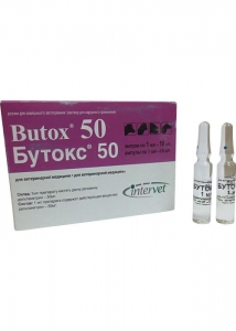 Бутокс® 50 Профілактика і лікування захворювань великої рогатої худоби і овець, спричинюваних ектопаразитами Опис Прозора масляниста рідина світло-жовтого кольору з різким запахом. При змішуванні з водою утворює емульсію білого кольору. Склад 100 мл препарату містять діючу речовину: дельтаметрин – 5 г. Допоміжні речовини: лимонна кислота, кальцію додецилфеніл сульфонат, метоксипропанол ацетат, поліетоксилат три-тер-бутилфенол, ароматичний розчинник. Фармакологічні властивості АТС vet QP53F, інсектициди (QP53 FАОЗ, дельтшиетрин) Діюча речовина препарату – дельтаметрин (група піретроїдів) ефективно діє при безпосередньому контакті на кліщів, вошей та мух, які паразитують на шкірі тварин. Механізм дії дельтаметрину полягає в активації натрієвих каналів мембран нервових клітин, незворотній деполяризації клітинних мембран і блокаді нервової провідності, що призводить до порушення рухових рефлексів, і в результаті чого настає повний параліч і загибель паразитів. Застосування Профілактика і лікування великої рогатої худоби і овець при ураженні ектопаразитами (кліщі, воші, волосоїди, мухи, ґедзі, клопи, мошки): велика рогата худоба: кліщі – Psoroptes bovis, Sшcoptes bovis; воші – Linognathиs vitиli (у телят); вівці: кліщі – Psoroptes ovis, Saгcoptes ovis, воші – Linognathиs ovillиs і L. pedalis; рунець овечий – Melophagus ovinиs. Дозування Застосовується лише зовнішньо. Захворювання Обприскування, кількість Бутокса® 50 мл/ 100 л води Купання, кількість Бутокса® 50,1л/100 л води Кратність обробки псороптоз, саркоптоз 100 100-150 З лікувальною метою – дворазово з інтервалом у 10 діб;з профілактичною метою – одноразово кожні 6 місяців сифункулятоз,мелофаrоз 25 25-37,5 Одноразово, повторна обробка залежить від рівня ураження паразитами арахноентомози 50 50-75 Одноразова обробка захищає тварин впродовж 6 – 8 тижнів Обробку тварин проводять у суху погоду за температури не нижче 12 °С. Купання тварин Після очищення ванни для купання, попередньо готують необхідну кількість суміші Бутокса® 50 (у відповідності з дозуванням для купання). Розподіляють розчин по всьому об’єму ємності, потім перемішують протягом 10 хвилин. Щоб отримати готову емульсію, спочатку необхідно пропустити 20 тварин, які добре змішають емульсію в ємності. Після того, як тварини винесуть з ванни 10 % від загального обсягу робочої рідини, її доповнюють до вихідного рівня необхідною кількістю суміші Бутокса® 50 і води. Перших 20 тварин слід купати повторно. Перед обробкою тварини не повинні бути втомленими і не повинні хотіти пити. Проводити лікування в дуже жарку погоду не рекомендується. Після обробки 3 тисяч овець акарицидну рідину зливають у відстійні колодязі, не допускаючи попадання у водойми або річки. Ванну ретельно очищають від бруду і промивають водою, яку також зливають у відстійні колодязі. Обприскування тварин Перед застосуванням Бутокса® 50 необхідно попередньо розвести препарат у 1 літрі води, додати до суміші необхідну кількість води в резервуар для обприскування і ретельно перемішати. Під час кожного курсу лікування необхідно використовувати мінімум 3 літри розведеного продукту на тварину. Послідовність обприскування: вушні раковини, голова, тіло, хвіст, область навколо анального отвору, кінцівки. Особливу увагу, необхідно приділяти ураженим місцям. Протипоказання Препарат не застосовують ослабленим і виснаженим тваринам. Застер