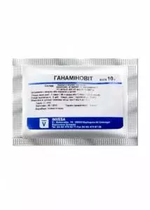 Ганаміновіт- порошок для орального застосування.Містить вітаміни А,Д3,Е,В,С,К,кальцію пантотенат,фолієва к-та,нікотинамід та всі незамінні амінокислоти. Призначений для лікування анорексії,анемії,загальної недостачі вітамінів та амінокислот,при стресах,знижуванні мясної та яєчної продуктивності,в період реконвалісценції для покращення апетиту с/г тварин та птиці. Дозування: Перорально з питною водою або кормом з розрахунку:птиця: 250-500г на 1 тонну корму протягом 4-8дн.,125-250г на 1000л 4-8 дн.,свині,коні:0,5кг/1000кг корму протягом 3-5 днів,250г/1000л 3-5 днів. Аналоги: Кальфостонік,Солвімін Селен. Переваги : Зручна фасовка що зручно в дозуванні.