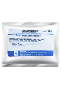 Ганаміновіт- порошок для орального застосування.Містить вітаміни А,Д3,Е,В,С,К,кальцію пантотенат,фолієва к-та,нікотинамід та всі незамінні амінокислоти. Призначений для лікування анорексії,анемії,загальної недостачі вітамінів та амінокислот,при стресах,знижуванні мясної та яєчної продуктивності,в період реконвалісценції для покращення апетиту с/г тварин та птиці. Дозування: Перорально з питною водою або кормом з розрахунку:птиця: 250-500г на 1 тонну корму протягом 4-8дн.,125-250г на 1000л 4-8 дн.,свині,коні:0,5кг/1000кг корму протягом 3-5 днів,250г/1000л 3-5 днів. Аналоги: Кальфостонік,Солвімін Селен. Переваги : Зручна фасовка що зручно в дозуванні.