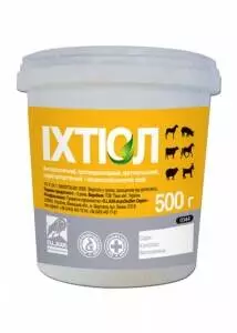 Застосування і дозування Зовнішньо призначають при захворюваннях шкіри (рани, екземи, опіки, дерматити, фурункульоз, піодермія), підшкірної клітковини і м'язів, при артритах, невралгіях, тендинітах, тендовагінітах, бурситах, маститах у формі мазі (10-30 %-вої) або водно-спиртових розчинів (10-30 %-вих). Спиртово-іхтіолові розчини (1:25) широко використовують у вигляді примочок при флегмонах, міозитах. При шкірних захворюваннях паразитарного походження, в тому числі при корості, парші, стригучому лишаї, іхтіол використовують у вигляді мазі (10-20 %-вої), лініменту і пасти (5-10 %-вих). При додаванні дьогтю, сірки і креоліну лікувальний ефект при корості і дерма- томікозах підвищується. Всередину іхтіол застосовують в якості антисептичного і протибродильного засобу при гострій тимпанії рубця, метеоризмі, функціональних розладах кишечнику, запаленнях шлунку і кишечнику, при гострому розширенні кишок у коней (коліки). При гострому розширенні шлунку у коней рекомендується промивати шлунок 1-2 %-вим водним розчином і всередину задавати спиртово- іхтіол-валеріанову суміш. Водні розчини іхтіолу (1-2 %-ві) призначають при випадінні і запаленні прямої кишки (зрошення у вигляді клізм), при крупозному запаленні гортані, запаленні стравоходу. Всередину іхтіол призначають у вигляді розчинів (1-2 %-вих), болюсів, мікстур, кашок. Дози іхтіолу всередину: коням - 10-30 г; великій рогатій худобі - 10-20 г; дрібній рогатій худобі і свиням - 1-5 г; собакам - 0,2-1г; лисицям - 0,2-0,5 г. В акушерській практиці його застосовують при метритах, вагінітах, сальпінгітах у вигляді спринцювання 3-5 %-вим водним розчином або свічок (дрібним тваринам 0,1-0,3 г). Для промивання очей при лікуванні телязіозу великої рогатої худоби викорис- товують 3-5 %-вий розчин іхтіолу. Форма випуску Полімерні контейнери по 50, 500г, 1кг. Зберігання Сухе темне місце. Термін придатності - 5 років з дати виготовлення.