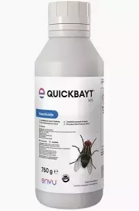 КВІК БАЙТ СПРЕЙ ОПИС Являє собою дрібні гранули від білого до бежевого кольору, при розчиненні у воді утворює суспензію. СКЛАД Містить діючу речовину: імідаклоприд в кількості 10%; допоміжні компоненти: трикозен Z-9 (статевий феромон мух, Muscalure) - 0,1%, LEJ 179 (ароматизатор) - 0,25%, бітрекс (гіркота) - 0,01%, цукор - 88,43%. ФАРМАКОЛОГІЧНІ ВЛАСТИВОСТІ Імідаклоприд, що входить до складу инсектицидного засобу, має виражену контактну і кишкову інсектицидною дією по відношенню до окрилених мух, включаючи Musca domestica, Fannia canicularis, Calliphora spp., Lucilia spp., Drosophila spp., тарганів, блох і іншим комах, в тому числі стійких до фосфорорганічних препаратів, піретроїдів і карбонат. Будучи антагоністом нікотин-ацетилхолінових рецепторів, імідаклоприд викликає гіперполяризацію мембрани нервових волокон комах, що призводить до тривалого відкриття натрієвих каналів, порушення передачі нервових імпульсів і загибелі комах. Статевий феромон мух забезпечує залучення комах на оброблену інсектицидним засобом поверхню, а наявність у складі цукру і ароматизатора сприяє його кращому поїдання комахами. Тривалість инсектицидного дії Квік Байта в залежності від типу оброблюваної поверхні зберігається до 4 - 8 тижнів. Квік Байт за ступенем впливу на організм теплокровних тварин відноситься до малонебезпечних речовин, в рекомендованих концентраціях не виявляє місцево, резорбтивно-токсичної і сенсибілізуючої дії. Для знищення мух, тарганів, бліх та інших комах на об'єктах різного типу. ДОЗИ І СПОСІБ ЗАСТОСУВАННЯ Інсектицидний засіб Квік Байт застосовують у вигляді суспензії шляхом розпилення або нанесення мазків на поверхню. Розпилення на поверхню. Для приготування робочої суспензії Квік Байта в ємності обприскувального пристрою при ретельному перемішуванні розчиняють інсектицидний засіб з розрахунку 25г гранул на 200 мл води кімнатної температури. Обсягу приготовленої суспензії досить для обробки поверхонь закритого приміщення площею підлоги 10 м2 або поверхонь закритого приміщення з площею підлоги 30 м2 (так, як обробляється 30% площі приміщення). Дезінсекцію проводять ветеринарні фахівці або особи, навчені безпечно працювати з інсектицидними засобами, шляхом вибіркового обприскування робочої суспензією Квік Байта не менше 30% поверхні стін і стелі приміщення. Смужки нанесення Квік Байта не повинні перевищувати 10 х 30 см Для знищення мух і тарганів досить застосування Квік Байта тільки в місцях сильного скупчення комах. Обприскують поверхні бажаних комахами (теплі сонячні стіни, віконні рами, підвіконня, двері, опори, частини огорож, труби, молокопроводи, плафони світильників і інші поверхні). Стіни в свинарниках обробляють на висоті вище 1,5 м, на фермах для великої рогатої худоби - на висоті вище 2 м від підлоги. Нанесення мазків на поверхню. У місцях, не придатних для нанесення інсектициду, розкладають і розвішують смужки картону або поліетиленової стрічки, попередньо оброблені робочої суспензією інсектициду. Для приготування робочого розчину в окремій ємності розчиняють 25г гранул Квік Байта в 20 мл води кімнатної температури і ретельно розмішують для отримання однорідної суспензії. Для нанесення мазків використовують малярні пензлики. На час проведення обробки з приміщення виводять тварин, прибирають залишки корму, води і молочний інвентар, накривають поліетиленовою плів