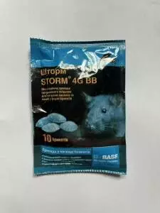 Засіб Шторм від щурів має вигляд воскових брикетів блакитного кольору, основною діючою речовиною яких є 0,005% флокумафен. Отрута для щурів Шторм - потужний антикоагулянтний родентицид, що досить ефективний проти широкого спектру гризунів - мишей, щурів, піщанок, полівок та ін. Це засіб від гризунів знищує навіть ті штами гризунів-шкідників, що стійкі до інших антикоагулянтною родентицидів. Засіб Шторм від щурів у вигляді воскових брикетів добре поїдається щурами. Отрута для щурів Шторм - одноразовий ефективний родентицид, завдяки застосуванню якого досягається високий рівень загибелі навіть трудноіскоренімих гризунів. Засіб Шторм від щурів і мишей призначене для використання на забудованих територіях населених пунктів, включаючи харчові, житлові, лікувальні та дитячі приміщення. Шторм знищує чорних і сірих щурів, будинкових мишей. Засіб можна використовувати як в сухих, так і вологих приміщеннях, підвалах, льохах, каналізаційної мережі, підземних спорудах. Отруту від щурів Шторм поміщають в ємності для розкладки приманок, на лотки або підкладки по одному брикету від мишей і по 2-3 брикету від щурів. Підвищити вживання засобів від щурів можна за допомогою розміщення отруєних приманок у спеціальні ємності, які перешкоджають їх розтягування гризунами. Ємності з брикетами слід розставити в місцях проживання гризунів: біля нір, уздовж стін і перегородок, на шляху переміщення. Між точками розкладу має бути відстань 2-15 метрів залежно від чисельності гризунів і захаращеності приміщень. Місця розкладки кошти «Шторм» від щурів слід оглядати через 1-2 дні, а пізніше з інтервалом 1 тиждень. До брикету, що повністю або частково з'їдений, слід додавати новий. Зіпсовані і забруднені брикети необхідно міняти на свіжі. Деякі брикети можна перемістити в нове місце. Такі роботи проводять до повного зникнення гризунів. Після закінчення боротьби з гризунами всі приманки і ємності потрібно зібрати для подальшого знищення або повторного використання (якщо вони придатні для даної мети). Трупи полеглих гризунів потрібно зібрати і знищити. Засіб Шторм від щурів можна використовувати як довго діючі точки отруєння, а також для запобігання можливого вселення та підвищення чисельності гризунів. Для цього ємності з брикетами розміщують в місцях можливого проживання гризунів і спостерігають за ними не рідше двох разів на місяць. Отруту від щурів Шторм забороняється використовувати в місцях оброблення та зберігання харчових продуктів, біля джерел води, а також у місцях, доступних для домашніх тварин і дітей. Під час роботи із засобом слід ретельно дотримуватися правил особистої гігієни: не приймати їжу і не палити. Після роботи руки необхідно вимити теплою водою з милом, а забруднений спецодяг замочити в мильно-содовому розчині протягом 5-6 годин. Зберігати засіб Шторм слід в щільно закритій упаковці в добре провітрюваному і недоступному для дітей та тварин місці, окремо від кормів і продуктів харчування.