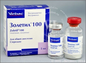 СОСТАВ И ФОРМА ВЫПУСКА Лекарственное средство в форме лиофилизированного порошка для инъекций белого или светло-желтого цвета в комплекте с растворителем (вода для инъекций) выпускается в стеклянных флаконах, укупоренных хлорбутаноловыми пробками и закатанных алюминиевыми колпачками. Каждый флакон содержит в качестве действующего вещества: 125мг тилетамина гидрохлорида и 125мг золазепама гидрохлорида (Золетил 50), или 250мг тилетамина гидрохлорида и 250мг золазепама гидрохлорида (Золетил 100). Вспомогательные вещества — натрия сульфат и лактоза. ФАРМАКОЛОГИЧЕСКИЕ СВОЙСТВА Тилетамин — общий анестетик диссоциативго действия, вызывающий выраженный анальгетический эффект, но недостаточное расслабление мышц. Тилетамин не подавляет глоточный, гортанный, кашлевой рефлексы, не угнетает дыхательную систему. Золазепам угнетает подкорковые области мозга, вызывая анксиолитическое и седативное действия, расслабляет поперечнополосатую мускулатуру. Золазепам усиливает анестетическое действие тилетамина. Он также предотвращает судороги, вызванные тилетамином, улучшает мышечную релаксацию и ускоряет восстановление после наркоза. Время наступления анестезии после внутримышечного введения индивидуально, поэтому после инъекции препарата следует установить тщательное наблюдение за животным. У кошек начало действия препарата после внутримышечного введения отмечается через 1-7 мин. Продолжительность анестезии зависит от дозы, но максимальный эффект обычно наблюдается через 20-60 мин. Период восстановления после наркоза варьирует от 1 до 5,5ч. У собак начало действия препарата после внутримышечного введения отмечается в среднем в течение 7,5 мин. Средняя продолжительность анестезии составляет около 30мин, период восстановления — до 4ч. В случае передозировки, а также у очень молодых и старых животных период восстановления более длительный. Действующие вещества Золетила метаболизируются в печени и выводятся с мочой. ПОКАЗАНИЯ К ПРИМЕНЕНИЮ Общая анестезия при диагностических процедурах и хирургических вмешательствах у кошек и собак. ПОРЯДОК ПРИМЕНЕНИЯ И ДОЗЫ За 24 часа до анестезии следует снять с животного антипаразитарный ошейник и выдержать 12-ти часовую голодную диету. За 15 мин до введения препарата рекомендуется подкожно ввести атропина сульфат в дозе: собакам — 0,1мг/кг массы животного, кошкам — 0,05 мг/кг массы животного. Содержимое флакона с порошком разведите прилагаемым растворителем. При внутримышечном введении потеря выпрямительных рефлексов происходит через 3-6 мин, при внутривенном введении — через 1 мин. Внутримышечное введение: Собаки: клинический осмотр — 7-10мг/кг; кратковременная общая анестезия при малых хирургических вмешательствах — 10-15мг/кг; длительная общая анестезия при обширных и болезненных хирургических вмешательствах — 15-25мг/кг. Кошки: клинический осмотр — 10мг/кг; длительная общая анестезия при обширных и болезненных хирургических вмешательствах — 15мг/кг. Внутривенное введение: Собаки: клинический осмотр — 5мг/кг; кратковременная общая анестезия при малых хирургических вмешательствах — 7,5мг/кг; длительная общая анестезия при обширных и болезненных хирургических вмешательствах — 10мг/кг. Кошки: клинический осмотр — 5мг/кг; длительная общая анестезия при обширных и болезненных хирургических вмешат